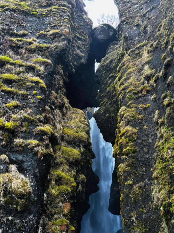 Gljúfrabúi is about a 600 meters’ walk away from Seljalandsfoss. It’s hidden inside a small canyon. You can see it from the path quite easily. If you want to see it up close, you can venture out into the canyon. This requires a lot of balance, as you will have to step from stone to stone and sometimes these will be big steps. Again, you will get soaked.