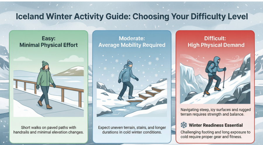 When I talk about “difficulty” here, I don’t mean how athletic you are or whether you run marathons for fun. I mean how much balance, patience, cold tolerance, and mental energy something quietly asks of you. In Iceland in winter, even the “easy” stuff involves standing around in the cold, watching your footing, and trying not to be blown into the sea by a sudden gust of wind.